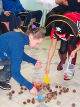 Все отлично справились с испытаниями, играли с огромным азартом и увлечением, после чего получили в награду чемоданчик с шоколадными монетами, и, согласно пиратским обычаям, поделили все по-честному.